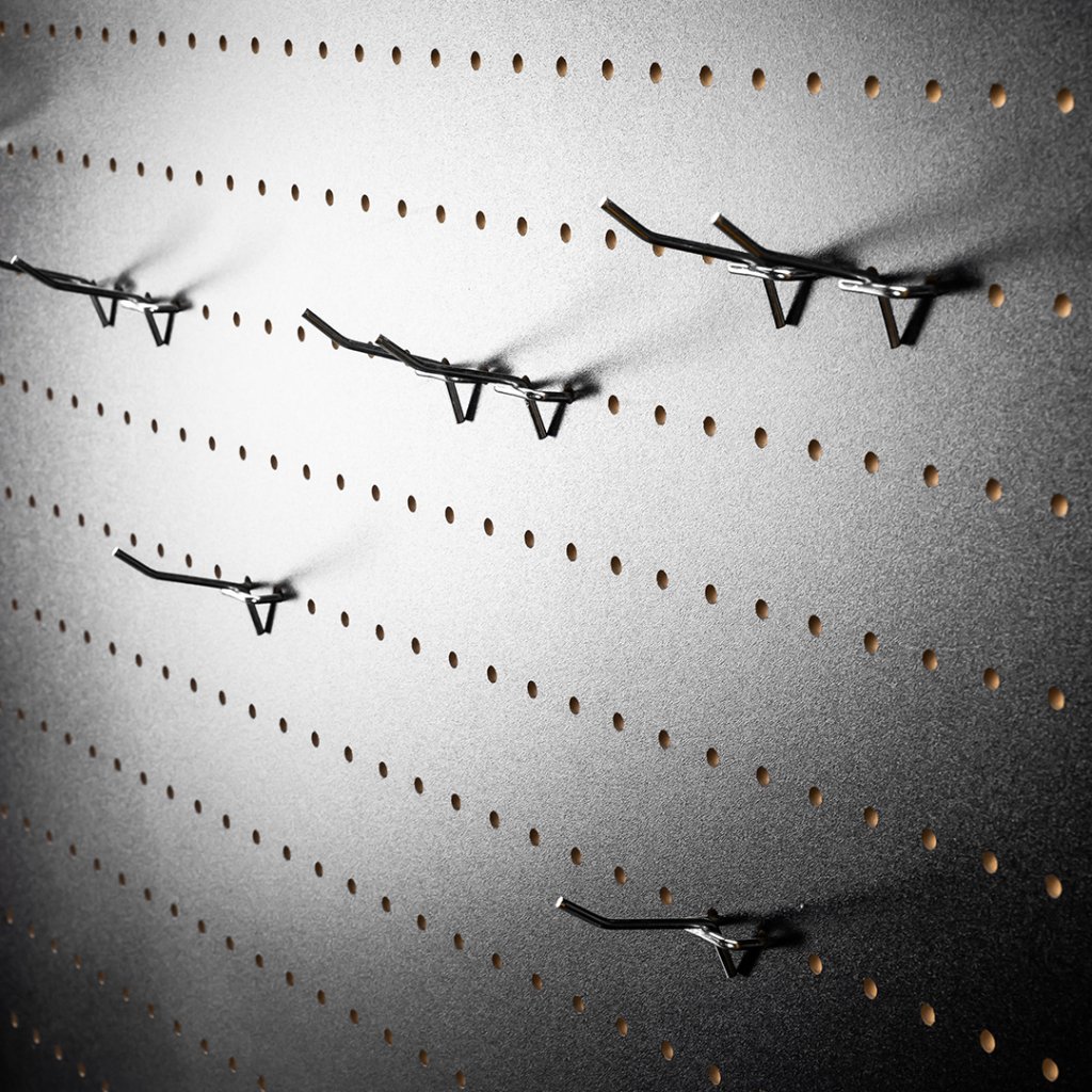 Integrirana zadnja stena z luknjami (pegboard) spremeni zadnjo steno v večfunkcionalni organizator, opremljen s kljukami, tirnicami in držali. Ta premišljena zasnova zagotavlja, da so vaša različna orodja in dodatki vedno na dosegu roke in popolnoma urejeni, kar zagotavlja dovolj prostora za orodje, majhne dele in druge delavniške potrebščine.