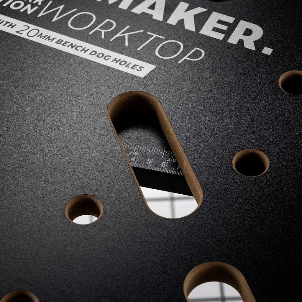 Inovativna zasnova omogoča enostavno menjavo delovnih plošč, kar vam omogoča, da obrabljenim površinam nadomestite z novo trdno ploščo ali se prilagodite specifičnim nalogam s preklopom na posebno perforirano ploščo za zatiče in primeže. Obe delovni plošči sta izdelani iz trpežnega MDF, zaključeni z odpornim črnim laminatom in vključujeta priročno natisnjeno merilno lestvico za natančne meritve.